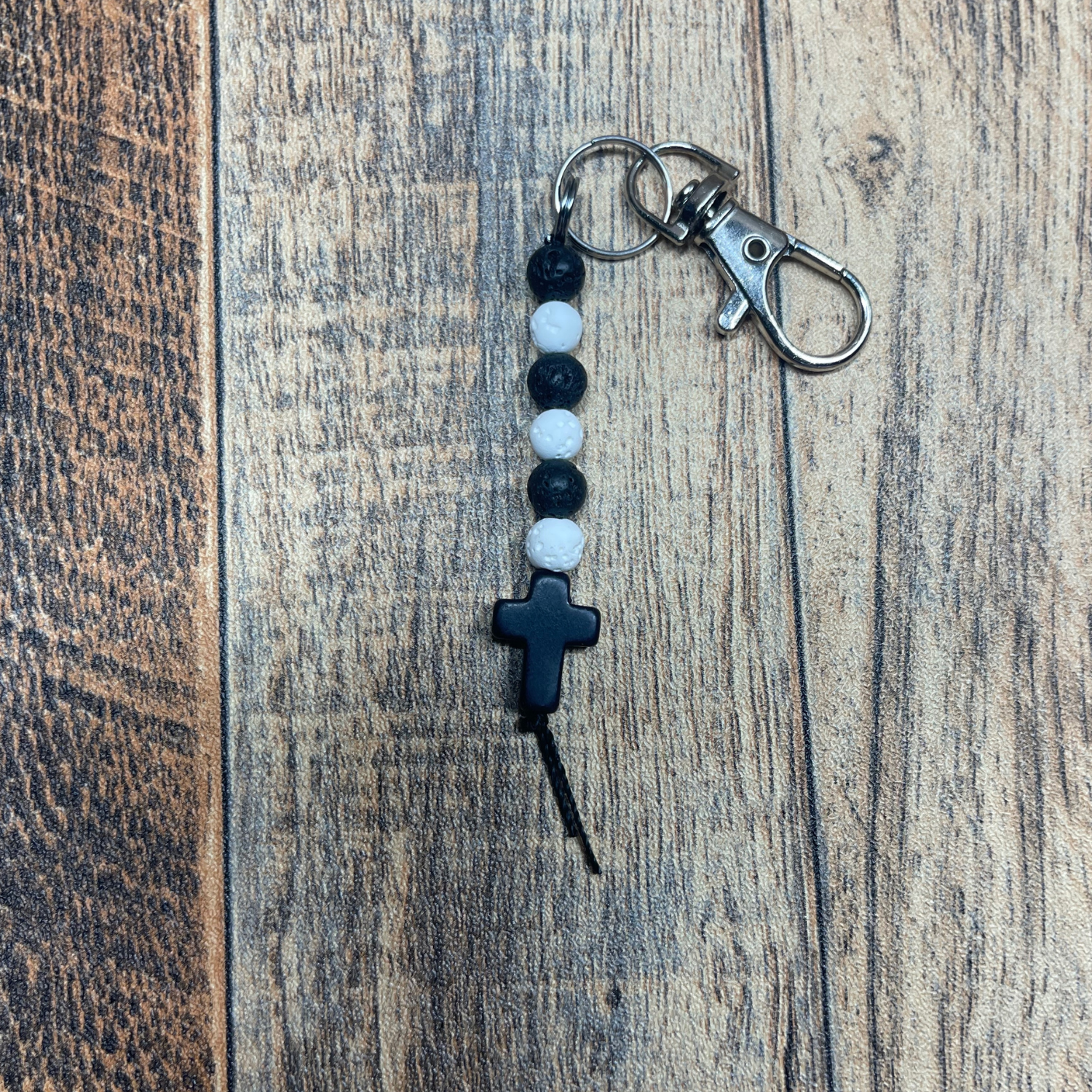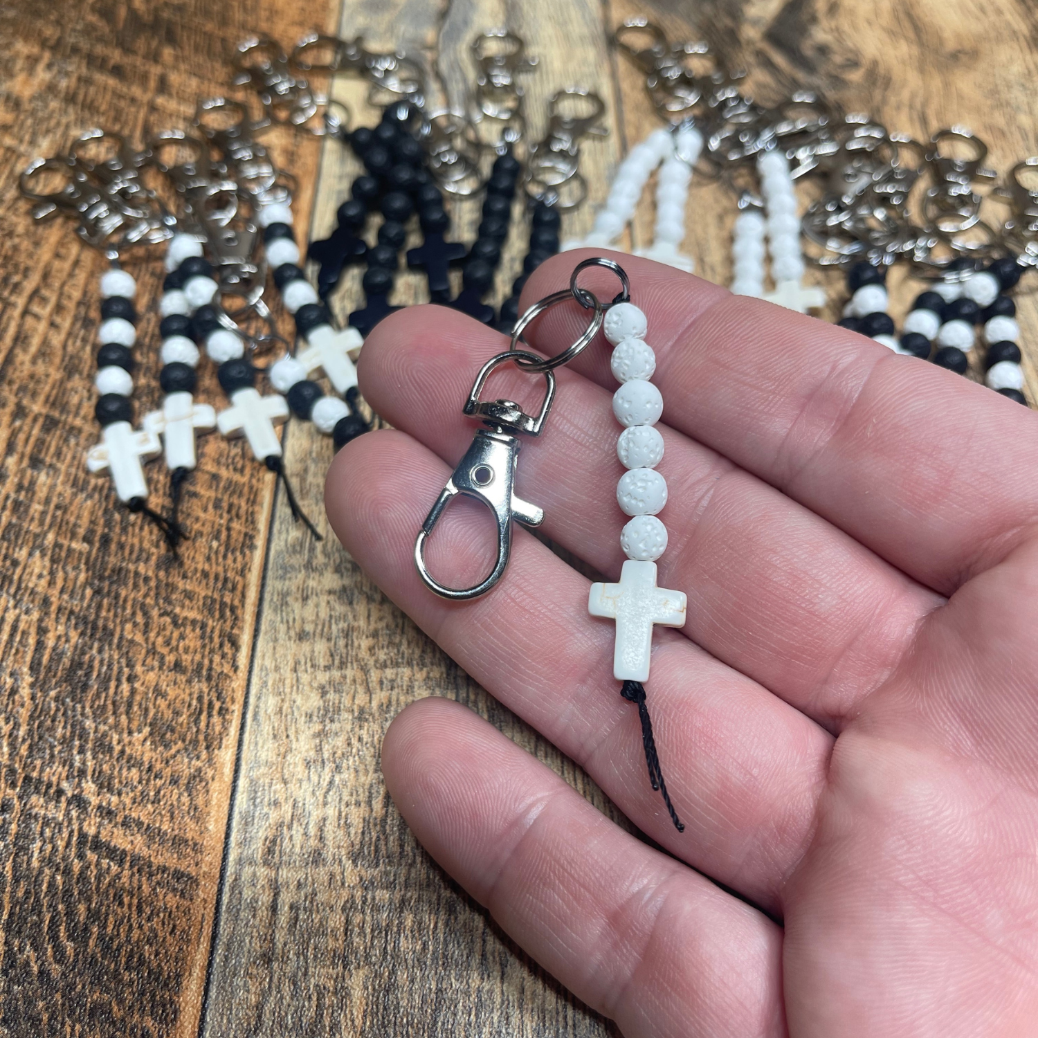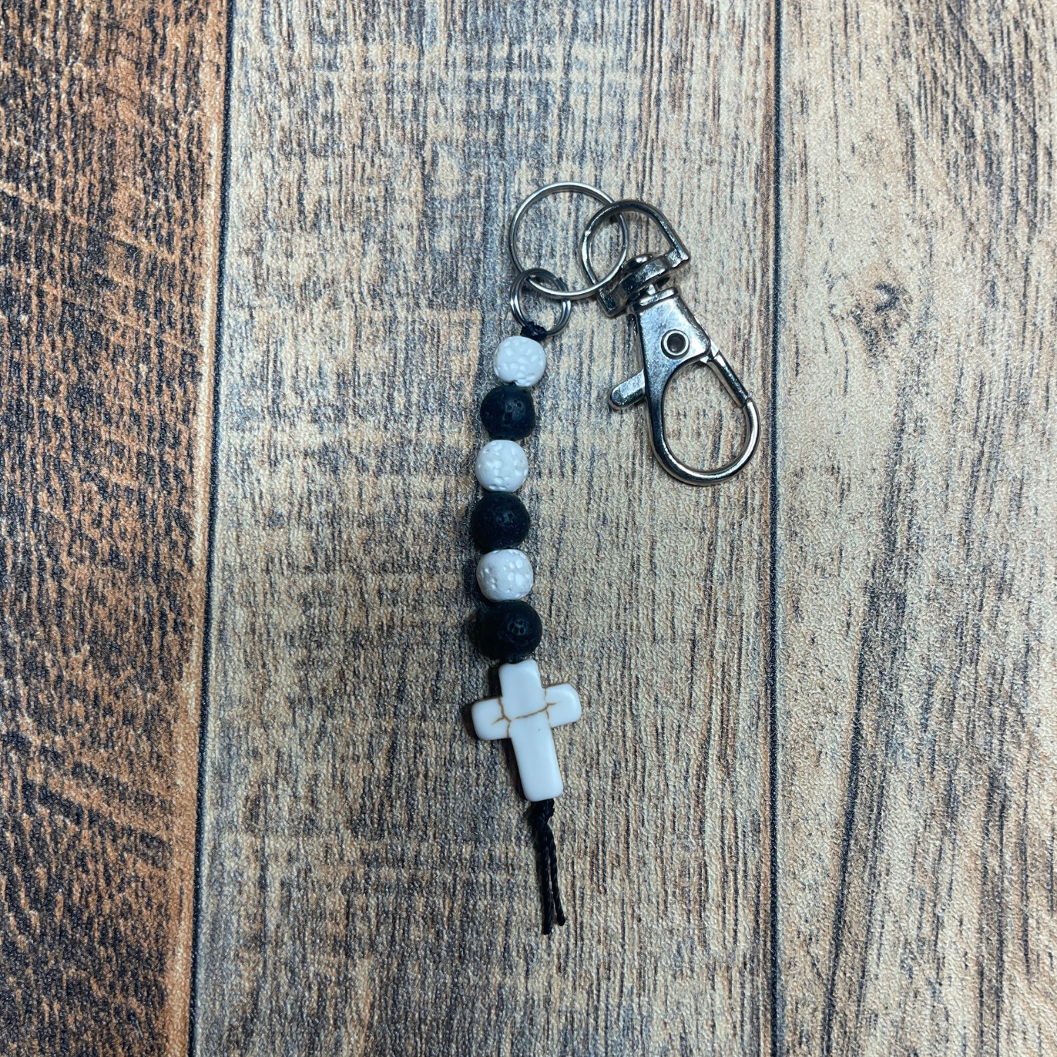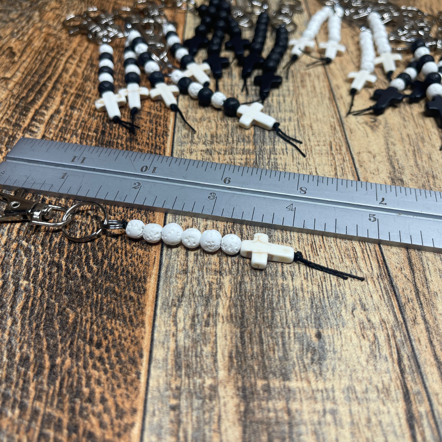 Discover the charm of our Black & White Stone Cross Keychain, a beautifully crafted piece that embodies elegance and spirituality. Each keychain is handmade, ensuring a unique and personal touch. It's a meaningful addition to your collection, reflecting your beliefs and values. Size: approximately 4" long.